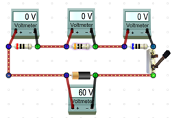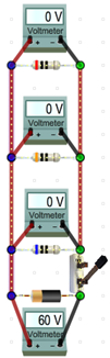 Add 60-V batteries to circuit (a)–(d) in the gaps provided. The quickest way to create a 60-V battery is to adjust the selector under the battery in the Toolbox to sixty and then drag a battery to each of the circuits. Remember, the selectors in the Toolbox set the values for any resistor or battery that you subsequently drag onto the circuit board. The selector in the Selected Element box adjusts the value of the currently selected (glowing) resistor or battery.