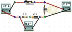 Now let's replace the resistor with an upside down bulb. Just drag the resistor off to the side. Make room for the bulb by Shift+dragging the voltmeter down a little. Now bring on a bulb, rotate it 180°, and put it where the resistor was. Record your new meter readings with the bulb.