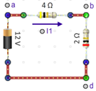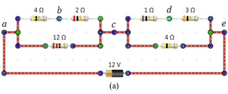 In the circuit in figure 15, a 12-V battery supplies current to a network of four resistors. If this was a section of a circuit in your car hooked up to your car's 12-V battery, you might want to know what size fuse should be provided to protect it from overload. Or if the 1.0-Ω resistor represented a bulb, you might want to know the proper wattage of the bulb that should be used. Many students find solving this sort of problem perplexing. This is partly because it can be quite tedious and partly because without direct experience with circuits, it's difficult to see how to visualize a solution. We'll now look at two different circuits. We'll answer a few questions about each one, first using direct measurement from our lab simulations, and then using an algebraic technique that requires that you reduce the circuit step by step to its simplest form and then use these circuits to create the necessary equations to solve for unknowns. Circuit 1 Figure 15a will be our first circuit. The two tasks are listed below.
