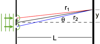 So how might we arrange for two sources of light to come together in phase, or out of phase, on a screen? You've probably read about a modified version of Thomas Young's famous experiment in 1801 that involved light passing through a single slit, then through a pair of closely spaced slits, and then being viewed on a screen in a darkened room. Using light from this single source to illuminate both slits insured that the light coming from the two slits was in phase. A more convenient method unavailable to Thomas Young by about 150 years is to use laser light. Due to its method of production, laser light is always in phase. In Figure 9, laser light diffracts separately through each slit, providing us two in-phase sources of light to illuminate our screen. We'll now set up our virtual apparatus in this two-slit mode, and use equations 1–7 to determine the wavelength of our monochromatic laser light.