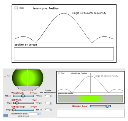 Use the numeric steppers beside the wavelength and the slit width sliders to select your unknown number for each of these. Leave the slit spacing at 250 µm and set the number of slits to one.