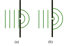 In Figure 4, we saw the interference pattern produced by of a pair of point sources, which produced circular waves in all directions. We then created a similar effect with light by using a pair of slits. But we also found an unexpected feature—the variation in brightness—something that our water wave model would not have predicted. The difference is due to the finite (as opposed to extremely narrow) size of our slits. Our slits are not really point sources. To understand why this is important, we first need to consider how waves actually travel through our slits. Christian Huygens developed a principle that explains how a wave front propagates, that is, how a wave front at one instant can produce a new wave front at a new position a short time later. He suggested that each point along a wave front acts as the source of tiny circular wavelets that move forward at the wave's speed. The wave front a moment later is the tangent to all these individual wavelets. In Figure (16a), we see a section of a long, straight wave traveling toward a narrow slit. The second wave from the left is shown producing three Huygens wavelets which result in a new straight wave. A wave produced three periods earlier is nearing the slit. In Figure (16b), just a tiny part of the wave has passed through the slit, leaving just the circular wave from that point-like section of the original wave to continue on. This is the behavior of waves passing through a very narrow slit—the waves act almost as if they're all coming from the same point, much like our water waves! As mentioned before, this bending into what would be expected to be shadow is called diffraction. Figures (16a) and (16b) demonstrate a case of strongly diffracted waves.