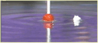 Let's look at the interference of a pair of waves on the surface of a tank of water. Figure 3 is a snapshot of a red marble jiggling up and down when partially submerged in a tank of water. A continuous circular surface wave is produced. The small bit of Styrofoam jiggles up and down with a slight delay due to the travel time of the wave.