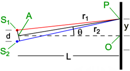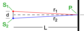 We've found that points of constructive or destructive interference are due to the difference in distance, the path difference, Δr, between the sources and positions on a screen. (This assumes that the sources are in phase, which they'll always be with this apparatus.) Specifically, if light travels λ, 2λ, 3λ, etc., farther from one source than from another, then constructive interference will occur. Similarly, destructive interference will occur if the path difference is 0.5λ, 1.5λ, 2.5λ, etc. In Figure 6, light sources S1 and S2 produce identical waves in phase. Since r1 and r2 are equal distances, all waves will arrive at point P in phase. Crests will arrive together, as will troughs. So point P will be a bright fringe. Due to the symmetry of the arrangement, we would call it the central bright fringe. This corresponds to point (ii) in Figures (4a–c).