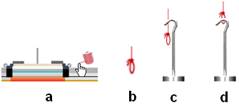 Drag the spool of massless red string somewhere just to the right of the cart (Figure 1a). Release it by releasing your mouse button. A segment of string will attach to the cart and find its way over the pulley. A small loop (Figure 1b) will form at its lower end.
