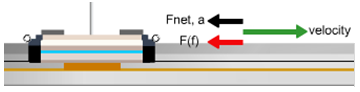 And finally, let's have a quick look at kinetic friction. For this study we'll just be working with the normal cart. The only force affecting its motion will be kinetic friction. So click Reset All to remove all the masses and hangers. So far the only friction force we've encountered is the one supplied by the cart brake. It's much too strong a force for our purposes. Instead, we'll use a friction pad similar to the brake. But this one is adjustable. In Figure 14, you see a snapshot of the cart traveling to the right at velocity vo. A friction force, the net force, acts to the left, thus slowing the cart down.