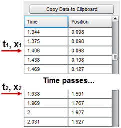 Find the last data pair before the cart starts moving. Ex. x = 0.098, 0.098, ..., 0.098, 0.108 ← the last 0.098. This will be our initial value, when vo ≈ 0. The cart's motion actually started between this instant and the one after it, but we'll get a fairly accurate number if we ignore this error.