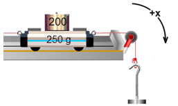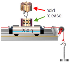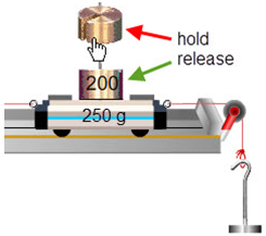 Now try a downward acceleration. Adjust the masses so that the right side is still 100 g and the left side is an empty 50-g hanger. Drag the cart to near the left end of the track.