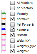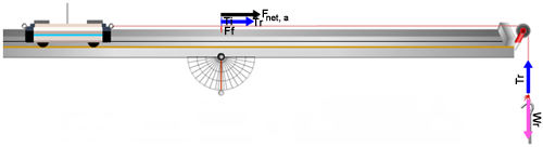 In Figure 4, the cart-hanger system remained at rest because of the brake which exerts a friction force, Ff, which changes to match any amount of weight that can be added to the hanger. When you release the brake the vectors should change to look like Figure 5. Try it at few times. There is now a net force, so there will be an acceleration. Try turning the brake on and off and notice how the forces change. You can also just hold and release the cart with the mouse. You're sort of acting like a brake but no vector will be shown to represent this.
