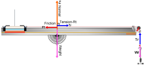 The hanger's weight, Wr, is gravity's pull downward on the hanger, so it's an external force. That is, it's a force exerted on the system from outside. The two tension forces, Tr, are internal to our cart-string-hanger system, so they don't affect its motion. The system does include the string. The pulley changes the direction of the tension force but doesn't affect its magnitude. The net external force, Fnet is equal to Wr. Observe the moving cart and note that the lengths of their vectors are equal. Just to make sure you understand, the net force is not a particular force acting on our system. It's the sum of all the external forces. Also, we often leave off the term "external" and just say net force.IC. Accelerated System of a Cart on a Level Track with Two Mass Hangers and No Friction