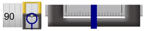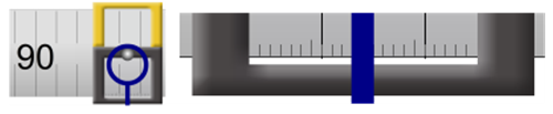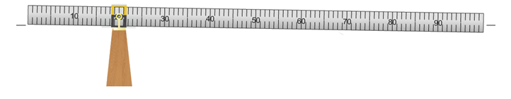 We now want to add a second clamp at 94.4 cm. Start by placing it at 94.0 cm. Using Figure 4a as a guide, do your best to place a hanger there. For a better view, right click (Ctrl+click) on the clamp and Zoom in to make fine adjustments. If you Zoom in about three levels you'll notice that there is a tiny set of 1-mm graduations inside the mass hanger clamp. See Figure 4a. You can even see them through a transparent section of the hanger. Drag the hanger left and right. Notice that the graduations are attached to the clamp not the meterstick. So they move against the background of the widely-spaced 1-cm marks. These millimeter marks tell you how far the clamp is away from a 1-cm mark.