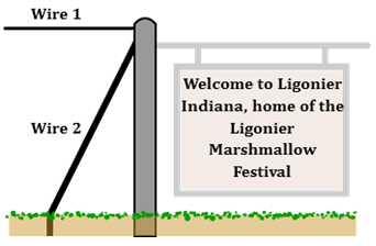 You saw in the exploration section that a force will produce its maximum torque when it acts perpendicular to the "lever." That is, when it acts perpendicular to r. (See Figures 2a–c.) But in many cases, that's not the most convenient choice. The weight of the sign in Figure 10 produces a cw torque that must be countered by an equal ccw torque. The guy wire supplying this torque would be under the least tension if it acted horizontally (Wire 1). But they often need to be attached to the ground (Wire 2). Thus, they're under a larger tension due to the reduced lever arm. This arrangement requires thicker wires, strong anchors, etc.