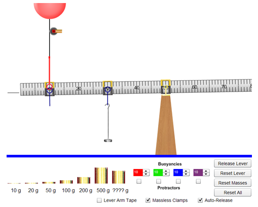 We need a clockwise torque to balance the 200-g mass. Thus, we need an upward force. Drag the loop of one of your balloons and attach it to the clamp at 10 cm. Nothing will happen because the balloon doesn't supply enough buoyant force to counter the torque of the 100-g mass.