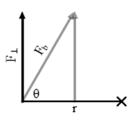 Fb is directed along a line going up to the pulley. The magnitude of F⊥ is equal to the side opposite θ. But it acts at the location shown in the figure. As we increased Fb, F⊥, the component of F perpendicular to r, increased proportionally.