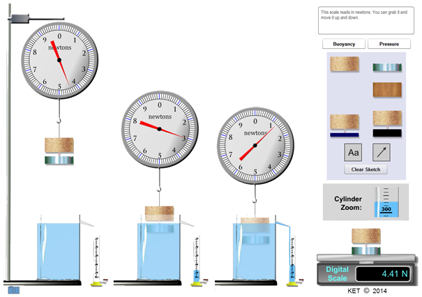 It's useful to leave all three cylinders fully submerged at about the same depth and then click the different icons to switch among the three materials. There is one thing that is the same regardless of the cylinder chosen. What is it? Why?