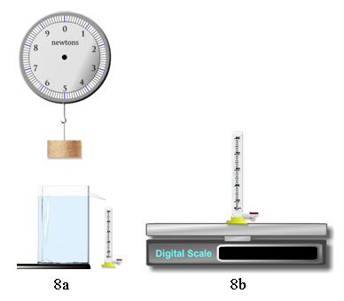 Weighing the cork disk in air (Figure 8a) gives us Wcork. Weighing it when partially submerged (8c) gives us Wcork'. This time it floats. (Note the slack string.)