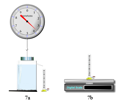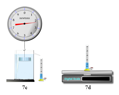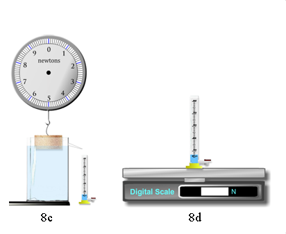 Weighing the empty graduated cylinder (8b) gives us Wcyl. Weighing the cylinder after receiving the overflow water (8d) gives us Wcylw displaced.