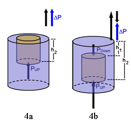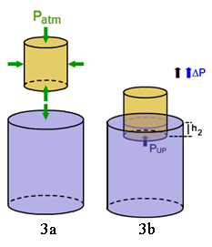 Click the Pressure button to load an interactive simulation. Adjust the small cylinder up and down as needed to recreate the discussion that follows. In Figure 3a, a solid brass cylinder is shown above a tank completely filled with water. Atmospheric pressure acts essentially equally on all sides of the cylinder and on the water's surface as indicated by the five Patm arrows in Figure 3a. At all times the horizontal pressures will cancel. So we need only examine the vertical pressures.