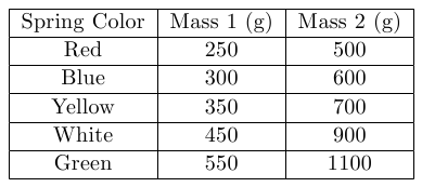 Consult Table A to determine what mass values to use with your spring. Remember to account for the mass hanger (all hangers are 50 g).