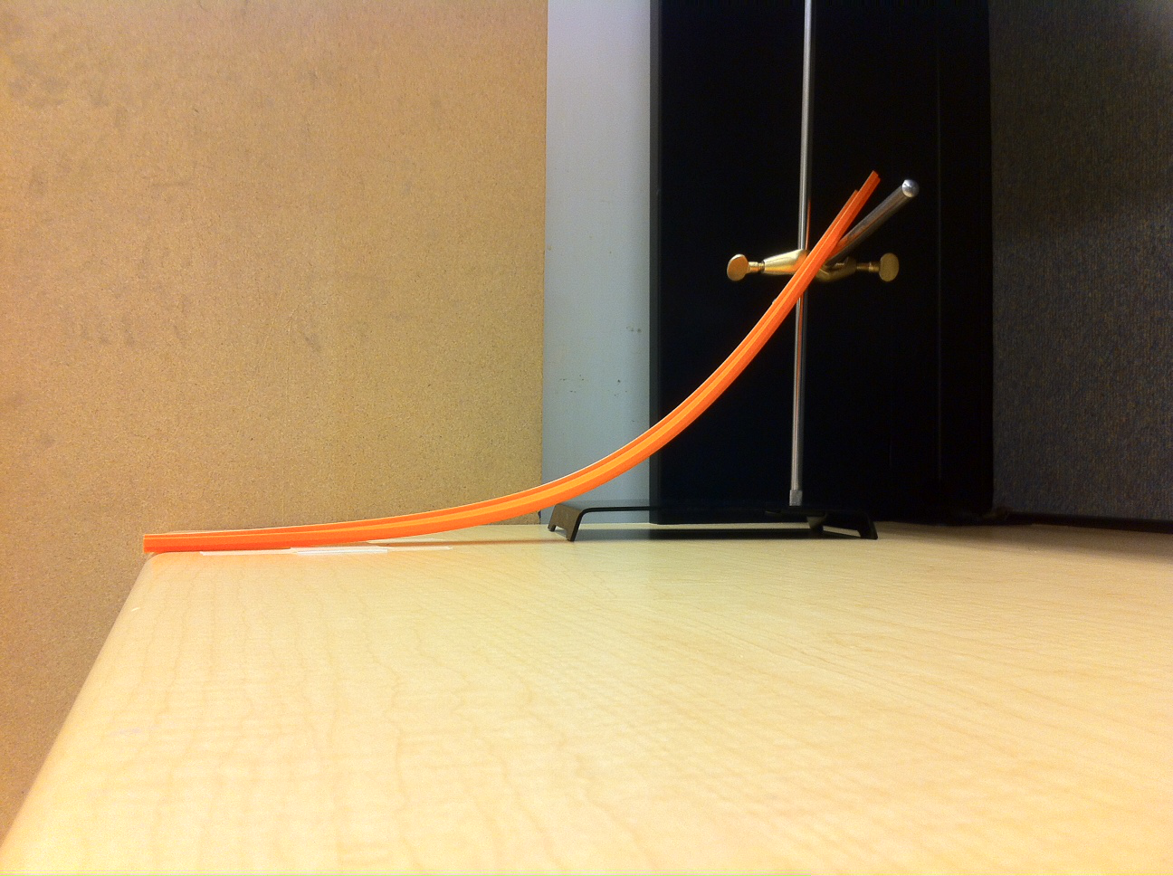 You will make your ramp out of a provided sheet of flexible plastic. The shape of the ramp actually does not matter, since we have only used conservation laws for the energy and the rotation rate is fixed by its translation rate as long as it does not slip on the track. We do want the ball to launch horizontally, so you should make it sit flat at the bottom (use the level provided to make sure this is true). Use your stand and the tape or clamp provided to make a setup as in Figure 1. Once the sphere leaves the ramp, there is no force acting on it to change its horizontal velocity (assuming there is no air resistance). Gravity pulls the sphere down the instant it leaves the ramp. We will consider the equations of motion for the vertical and horizontal motions of the sphere. The vertical distanceh2