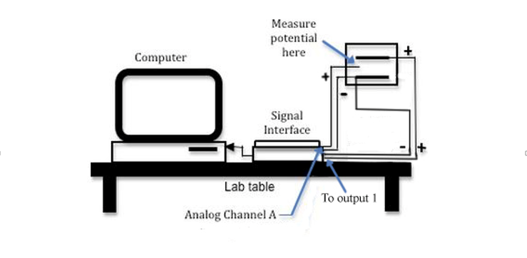 The + wire from the voltage probe will be placed at various locations around the configuration and will measure the potential difference between that location and the electrode connected to the first voltage probe wire.