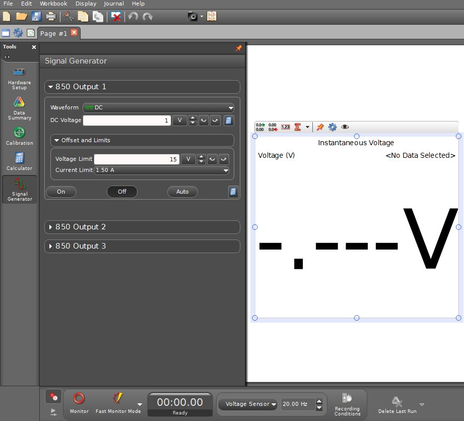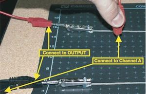 Insert the voltage probe (the plug with a red and a black lead) into the analog channel A of the PASCO 850 Universal Interface, and connect two wires to Output 1 of the interface.