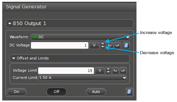 The "Signal Generator" window is shown to the left of the Voltage display. Set the DC voltage to 5 V using the Up arrow/Down arrow buttons (up to increase the value and down to decrease the value) to the right of the voltage setting, shown in Fig 9.