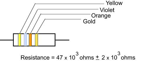 Ammeters are used to measure the current flowing in a circuit. To do so, the ammeter should be connected in series with the circuit element through which you want to measure the current. Introducing an ammeter into a circuit should not affect the flow of current in the circuit and, therefore, ammeters have very low resistance. Voltmeters are used to measure the potential difference or voltage drop across a circuit element. To do this, the voltmeter should be connected to the two points across which you want to measure the potential difference. In other words, the voltmeter should be connected parallel to the circuit element. Voltmeters should not affect the current flowing through the circuit element and, therefore, voltmeters have high resistance. This prevents current from flowing through them.Reading the Resistor Code