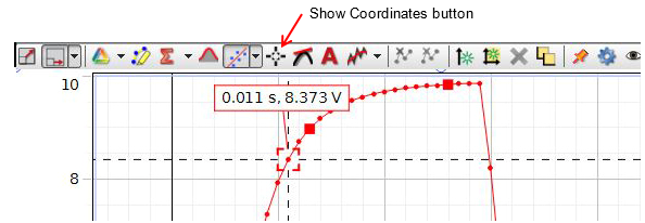 When show coordinates is active, a read-out of the voltage and time is displayed wherever you drag it, as in Fig. 11. Using this tool, determine and record the starting time (i.e., when the trace started upward from 0 volts) on the worksheet.