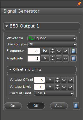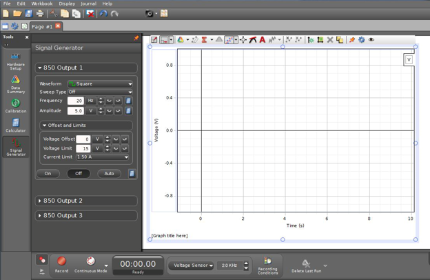 If not already set when the Capstone file opens, set the signal generator to produce a square wave of 5-V amplitude at a frequency of 20 Hz, and set the voltage offset to 5 V.