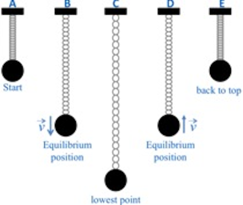 Consider several critical points in a cycle as in the case of a spring-mass system in oscillation. A spring-mass system consists of a mass attached to the end of a spring that is suspended from a stand. The mass is pulled down by a small amount and released to make the spring and mass oscillate in the vertical plane. Figure 2 shows five critical points as the mass on a spring goes through a complete cycle. The equilibrium position for a spring-mass system is the position of the mass when the spring is neither stretched nor compressed.