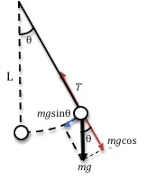 This force depends on the mass of the bob, the acceleration due to gravity g and the sine of the angle through which the string has been pulled. Again Newton's second law must apply, so