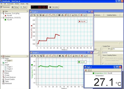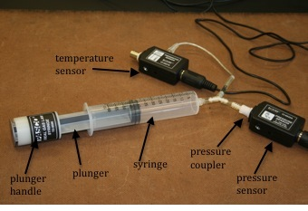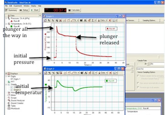 Monitor the graphs of pressure and temperature on the computer screen, and continue to hold the plunger in until the values stay constant. This should take about 10 seconds.
