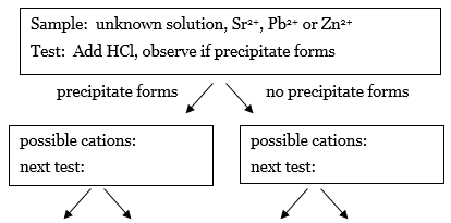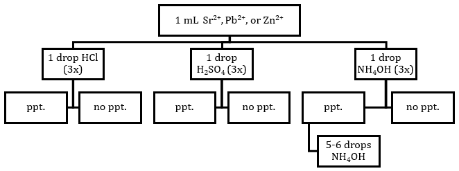 You will now use the results in Table 1 to devise an analysis scheme that can be used to identify the solutions of cations (Sr2+, Pb2+, or Zn2+) in water. The first step is to prepare an analysis scheme in the form of a flow chart that describes the series of tests using HCl, NH4OH, or H2SO4 that could be used to identify any of the cations Sr2+, Pb2+, and Zn2+ in a solution. The end goal is to have a flowchart with arrows pointing to other tests that ends in 3 boxes that contain only one cation. The result of each test points the way to the next test you need to perform.-