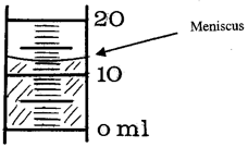 Add distilled water up to about the 48 mL mark on the graduated cylinder. The volume of solution in the cylinder is read at the bottom of the curved meniscus of solution (see example in Figure 2).