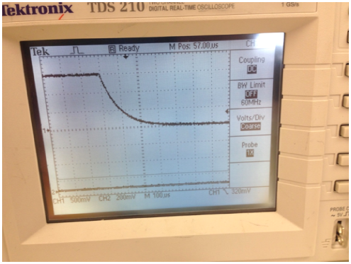 Rotate the knobs on the oscilloscope to display the decaying voltage on the inductor such that the trace touches the top line of the screen and decays to the bottom line of the screen. The trace does not have to fill the screen (horizontally), but it does have to extend over at least 4–5 divisions in order to measure the decay constant. (See Figure 10.)