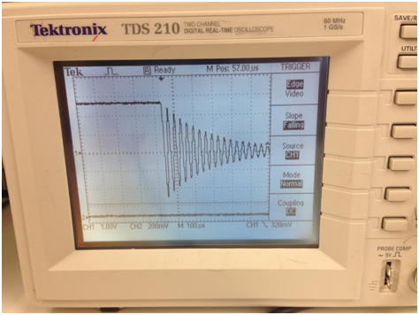 Rotate the knobs on the oscilloscope to display the oscillating voltage on the capacitor such that the trace is centered on the screen. Since for this part of the experiment, you wish to measure the frequency of these oscillations, you will need to adjust the sweep speed to allow you to measure the time between cycles of this oscillation. Note that these oscillations gradually decay away to zero if we wait long enough. (See Figure 12.)