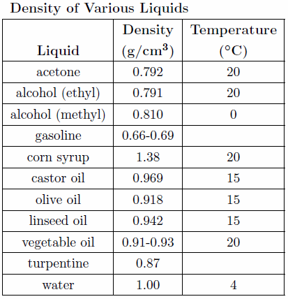 When doing the calculations in this lab (and all subsequent labs) pay strict attention to the rules governing significant figures described in Appendix A. The result for each calculation should include the proper units and an estimate of the experimental uncertainty where appropriate formulas used in the calculations should be clearly indicated. A useful table to use in determining the unknown liquid in the cylinders is shown below in Table 1.