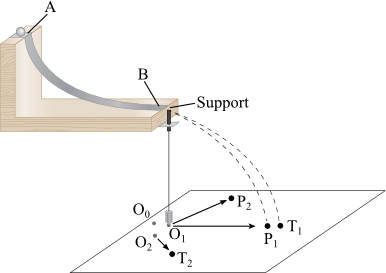 Place the target on the support. Release the projectile from point A and note where the target lands after the collision. It should fall at a point at or just beyond P1. If it lands too short or too much to the side, check the alignment of the target support once more to be certain that the collision is head-on.