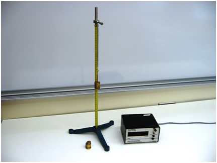 Hang the spring from the eye-bolt at the top of the support rod. Hook the mass holder onto the bottom end of the spring and if necessary add enough slotted masses to the mass holder to just separate the coils of the spring. Observe the position of the bottom of the mass holder on the ruler. Call this value y0 and record its value.