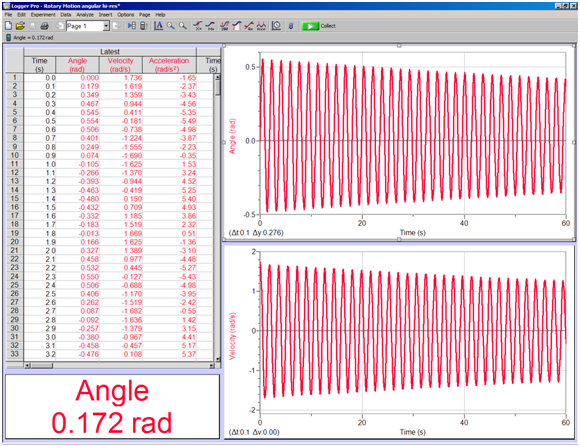 The table window on the left of the screen is a spreadsheet containing the measured values for time and position (θ). Use from four to six complete cycles and record the elapsed time between the start of the first chosen cycle and the end of the final chosen cycle in order to determine the period for this configuration of the pendulum.