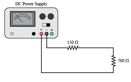 Connect the two resistors on the circuit board that are marked 150 ohm and 700 ohm as shown in Figure 4. They are said to be in series because all the current that passes through one also passes through the other. Make sure the power supply voltage is set to zero. Connect the power supply to the series resistor combination as in Figure 4. Set the power supply to 5 volts. Set the multimeter dial to the 20 V range and use the COM and V jacks. With the multimeter, measure and record the potential differences (voltage) V150 and V700 across each resistor and the voltage, V, across the two-resistor combination.