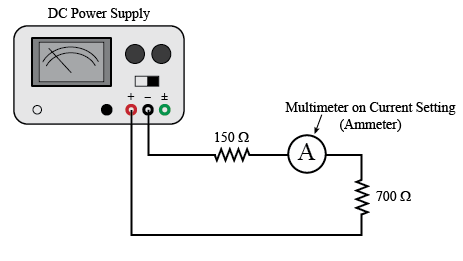 After being given the go-ahead by your TA, turn on the power supply and set it to 5 volts. Measure the current in the wire between the two resistors, the wire between the 700 ohm resistor and the power supply and the wire between the 150 ohm resistor and the power supply. Verify that these three currents are equal.