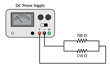 Make sure the power supply voltage is set to zero. Connect the power supply to the parallel resistor combination as in Figure 6b. Set the power supply to 5 volts. With the multimeter, measure and record the currents I150 and I700 flowing through each resistor and the total current, I, flowing through the power supply.