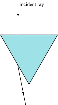 With the single ray setup for the light source, tape another circular sheet of paper onto the ray table. Place the triangular prism on the paper so only a single ray is incident normal to one face of the prism and a ray emerges back into the air at the opposite face (Figure 6).