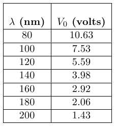 The following data is an example of measured stopping potential, V0, as a function of the wavelength, λ, of the light.