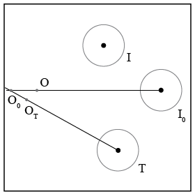 Draw a straight line from point I0 (the center of the circle) to point O and extend it back several centimeters past O. Draw a straight line from T to OT and extend it back beyond OT until it intersects the extended OI0 line. Label the point of intersection O0. This is the position of the incoming ball just when it collides with the target ball. Your paper now should look like Figure 5. The figure shows just the centers of the circles, not the individual landing points.
