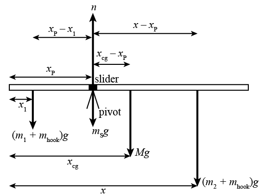 are entries from one row of your data table, n is the normal force exerted on the meterstick by the pivot, and mS is the mass of the slider. We don't know n or mS but we will see that they won't enter into our analysis. g is the acceleration due to gravity, but it won't enter into our analysis either.