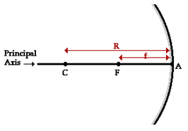 the vertex and the center of curvature is a point known as the focal point; the focal point is denoted by the letter F in the diagram. The distance from the vertex to the center of curvature is known as the radius of curvature (abbreviated by R). The radius of curvature is the radius of the sphere from which the mirror was cut. Finally, the distance from the mirror to the focal point is known as the focal length (abbreviated by f).