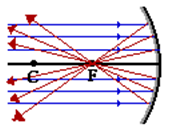 The focal point is the point in space at which light incident towards the mirror and traveling parallel to the principal axis will meet after reflection. The diagram below depicts this principle. In fact, if some light from the Sun was collected by a concave mirror, then it would converge at the focal point. Because the Sun is such a large distance from the Earth, any light rays from the Sun which strike the mirror will essentially be traveling parallel to the principal axis. As such, this light should reflect through the focal point.